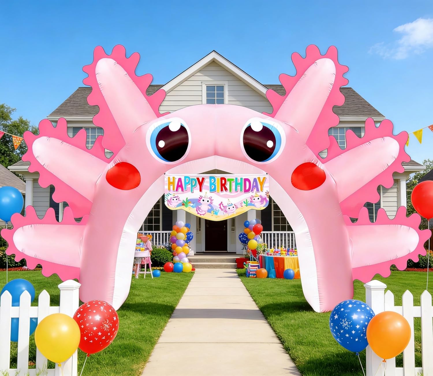 Pink Salamander Inflatable Arch】: This 16 ft pink axolotl inflatable arch features an adorable design with eight pink tentacles and three interchangeable banners. The axolotl also carries the beautiful symbolism of regeneration. It’s the perfect choice for axolotl enthusiast gatherings or pink-themed birthday parties.