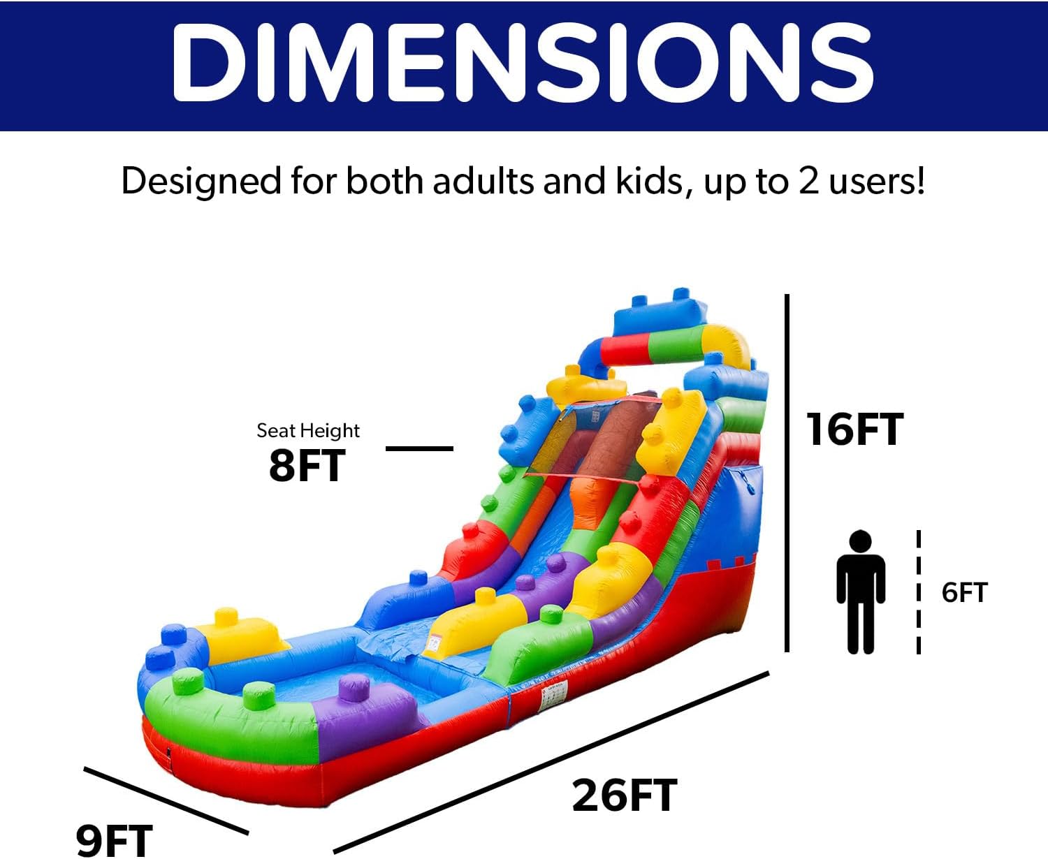• Dimension & Capacity: This inflatable measures 26ft in length, 9ft in width, and 16ft in height. The 26ft sliding path is reinforced to support both children and adults, making it suitable for multi-generational use.