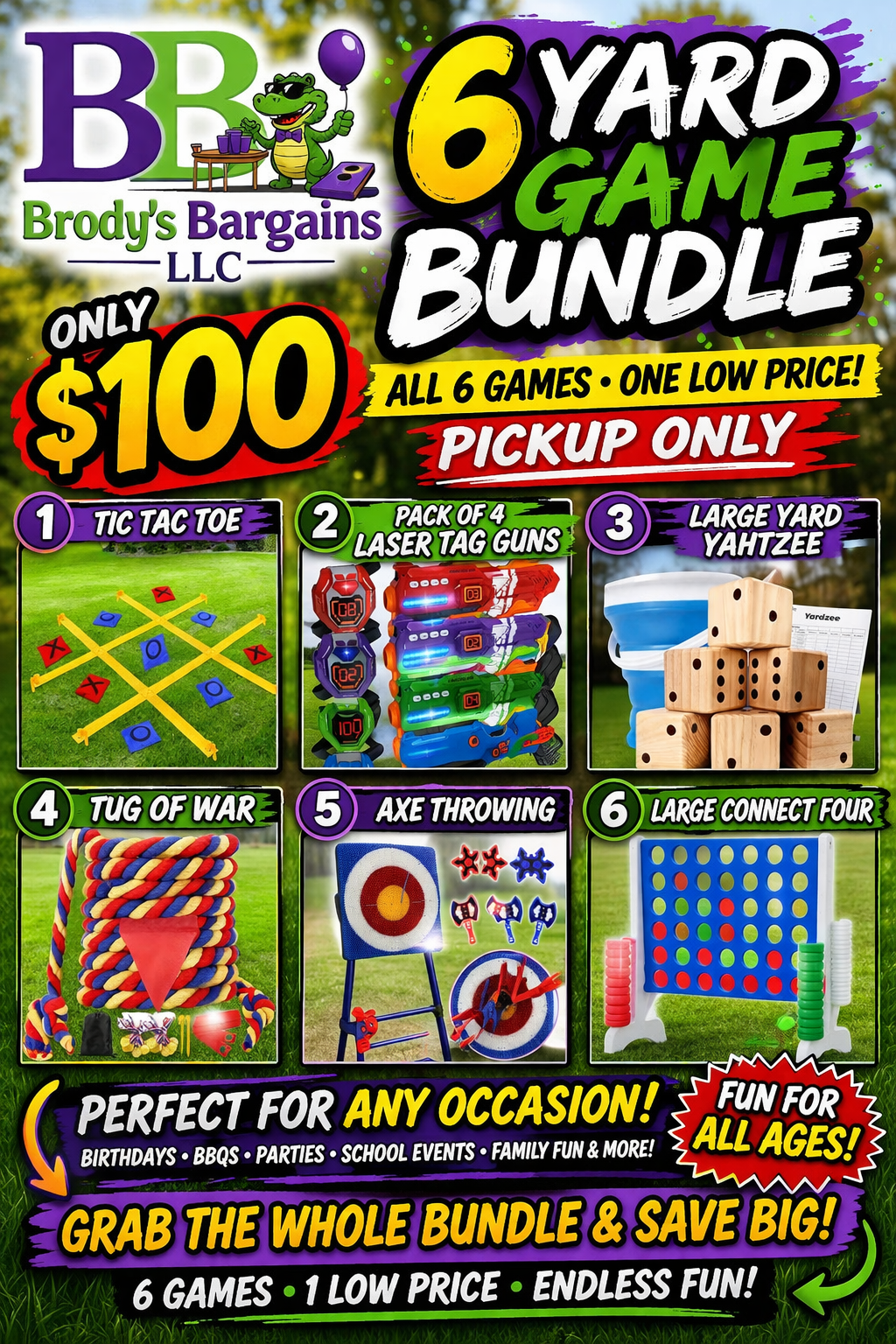 Be the first to review “Bundle of 6 Games: Tic Tac Toe, Laser Tag, Large Yahtzee, Tug of War, Axe Throwing, Large Connect 4”